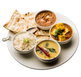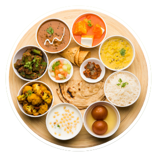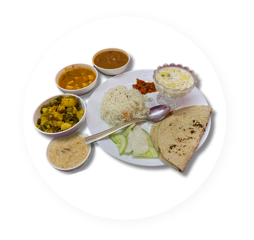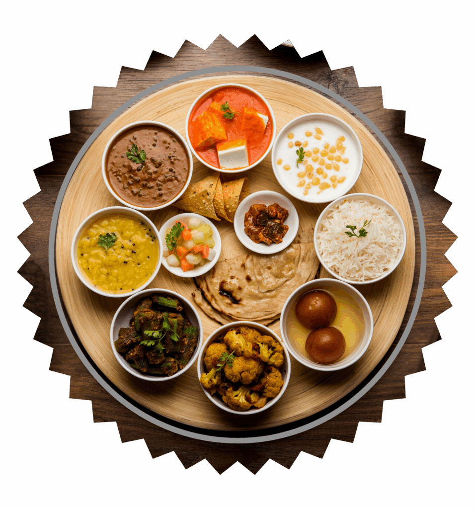 Unlock the richness of our thali spread. A harmonious blend of savory curries, delightful sides & treats, crafted with passion to bring you the essence of Indian home cooking.