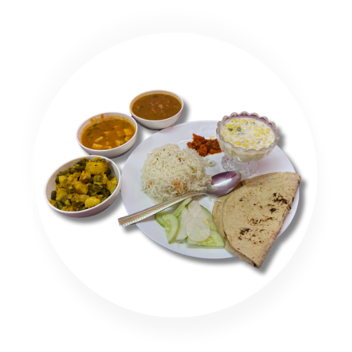 Balanced and nutritious vegetarian meal — sabzi, dal, rice, chapati, raita, and dessert crafted with health and taste in mind.
